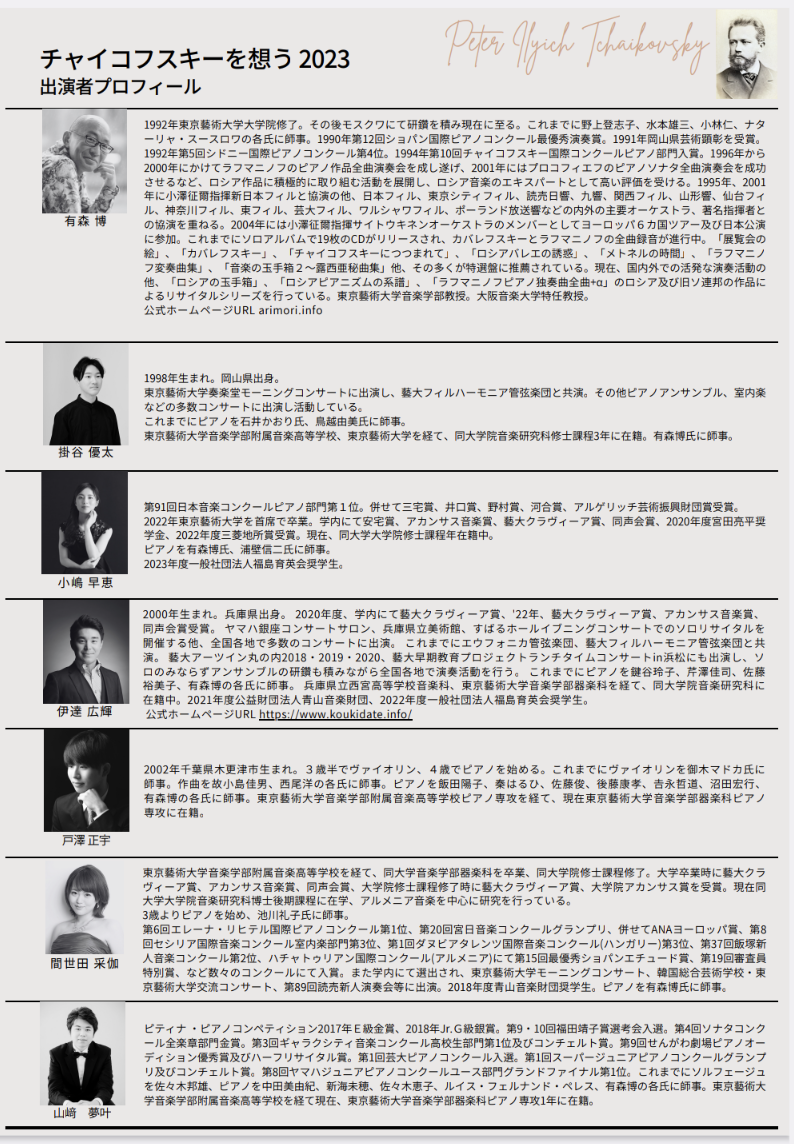 チャイコフスキーの交響曲を中心としたオーケストラ作品を、2台8手ピアノでお送りするコンサート。毎年12月に開催。