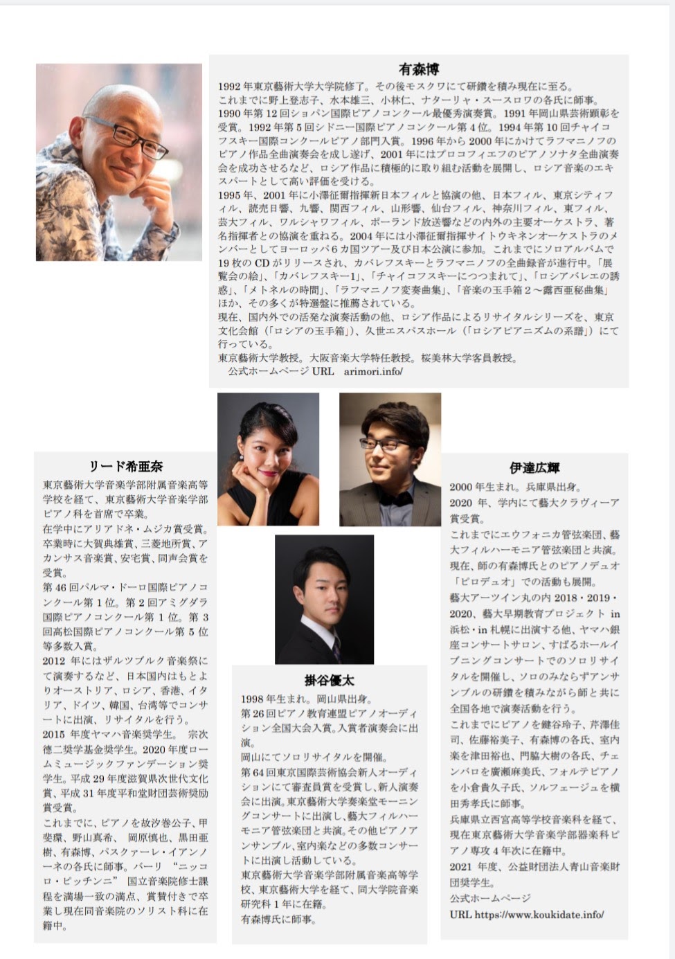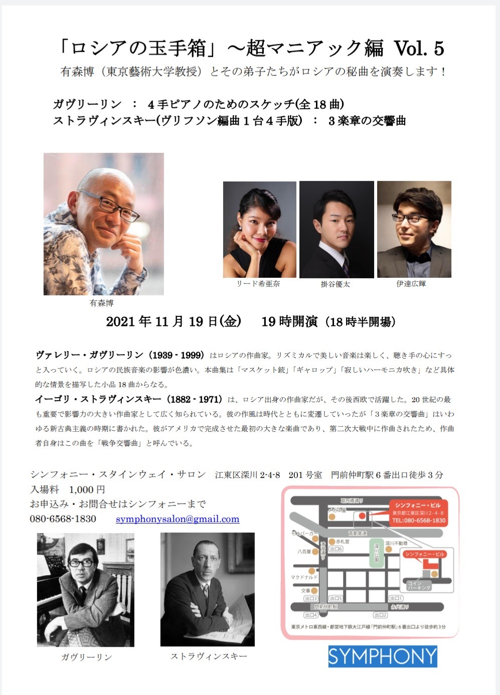 有森博とその弟子たちが、1台4手を中心に、演奏機会が極めて少ないロシアの秘曲を演奏します!1997年より毎年11月に開催中。